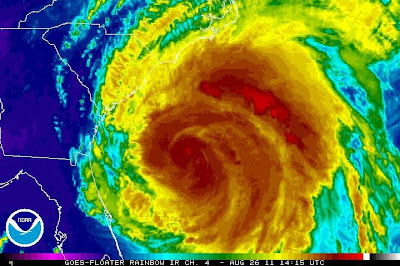 [Hurricane Irene, still a category two storm as of mid-day Friday, eyes the North Carolina coast. Satellite photo by NOAA.]