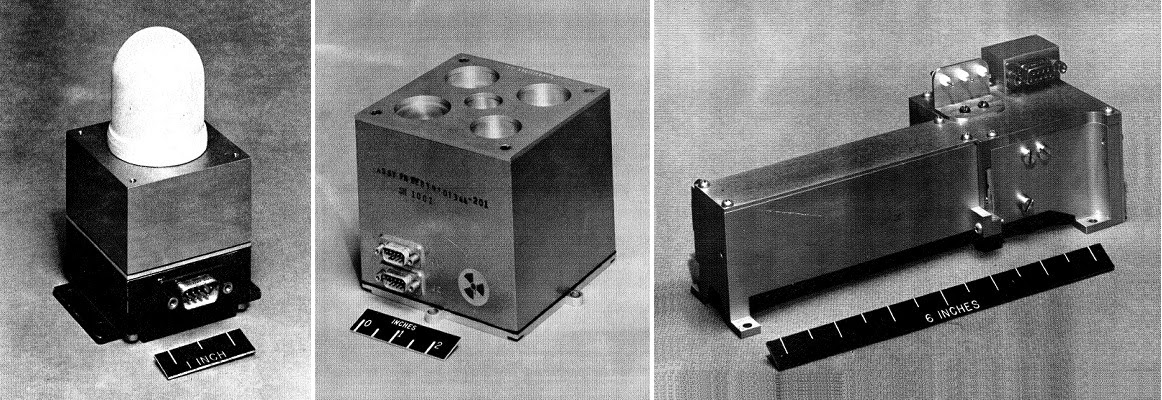 | Some of the instruments carried on board the 1968 probe. From left to right: An ion chamber dosimeter, a geiger tube spectrometer and the heavy ion experiment. Image: NASA |