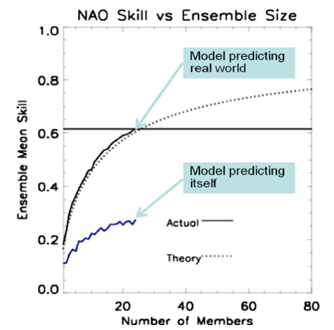 Or do they? Last year, Adam Scaife and Doug Smith of the UK’s Met Office published a review article in Nature Climate and Atmospheric Science which highlighted what they consider a “paradox” in ensemble predictions. The crux of the matter is this: for many models, the ensemble predictions provide a poor measure of the likelihood of a single simulated outcome… this might just suggest that chaos rules and there is little predictability, except for the surprising fact that the ensemble produces much more accurate predictions of the single real-world outcome. In other words, these models are better at predicting the real world than they are at predicting themselves!